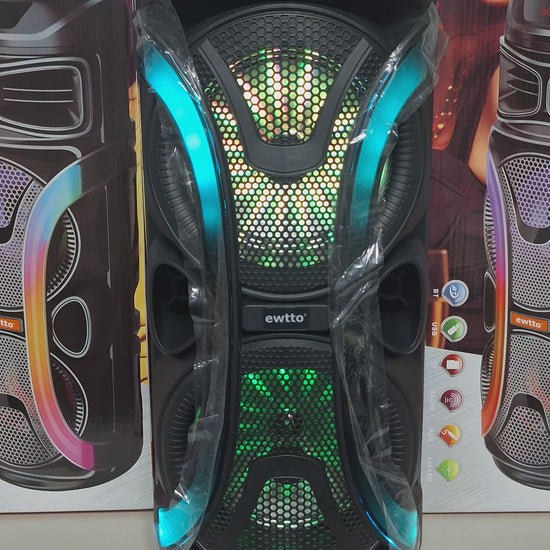 La Torre de Sonido marca Ewtto tiene incorporada Dos Bocinas de 8 pulgadas con Subwoofer y Sonido de Alta Potencia con Bajos Fuertes, ideal para escuchar tu música en Casa, incluye Gratis un Micrófono Inalámbrico para que puedas cantar o amenizar pequeñas fiestas y reuniones. Es Recargable y Portátil para que puedas llevarla a cualquier lugar.